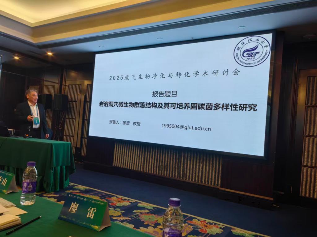 大会主席由天津大学青年长江学者王灿担任,会议期间,还设置了海报展示、分会场讨论等多种交流形式,为参会者提供了广泛的交流平台。大会设立6个分会场,分会主题分别是:废气生物净化与转化、双碳实施路径与碳污协同、人工智能+大气污染源解析、能源转型与大气环境、环境功能材料开发、重点行业污染精准防控与减污降碳协同技术、研究生专场。贺克斌院士做了主旨报告,廖雷教授作了题为“岩溶洞穴微生物群落结构及其可培养固碳菌多样性研究研究”的报告。该报告彰显了我院在该领域的科研活力,为废气生物净化及转化研究及其应用等贡献更多创新力量。
