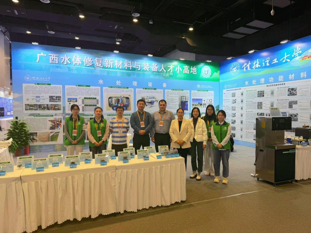 桂林理工大学参展人员与外国友人在展区合影,共话水处理技术创新