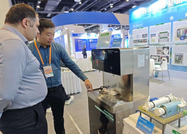 展会现场,桂林理工大学环境科学与工程学院老师及志愿者们与中外嘉宾交流洽谈、讲解水处理功能材料与装备创新成果,互动热烈